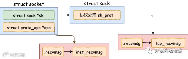 调用 socket 对象 ops 里的 recvmsg, 回忆我们上面的 socket 对象图,从图中可以看到 recvmsg 指向的是 inet_recvmsg 方法。