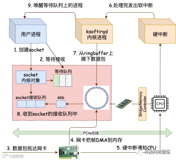 在上面的 demo 中虽然只是简单的两三行代码,但实际上用户进程和内核配合做了非常多的工作。先是用户进程发起创建 socket 的指令,然后切换到内核态完成了内核对象的初始化。接下来 Linux 在数据包的接收上,是硬中断和 ksoftirqd 进程在进行处理。当 ksoftirqd 进程处理完以后,再通知到相关的用户进程。