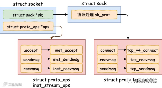 在 inet_create 中,根据类型 SOCK_STREAM 查找到对于 tcp 定义的操作方法实现集合 inet_stream_ops 和 tcp_prot。并把它们分别设置到 socket->ops 和 sock->sk_prot 上。
