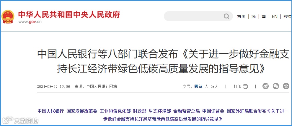 8月28日,链向科技集团从中国政府网了解到,近日,经国务院同意,中国人民银行联合国家发展改革委、工业和信息化部、财政部、生态环境部、金融监管总局、中国证监会和国家外汇局制定印发《关于进一步做好金融支持长江经济带绿色低碳高质量发展的指导意见》(以下简称《指导意见》)。