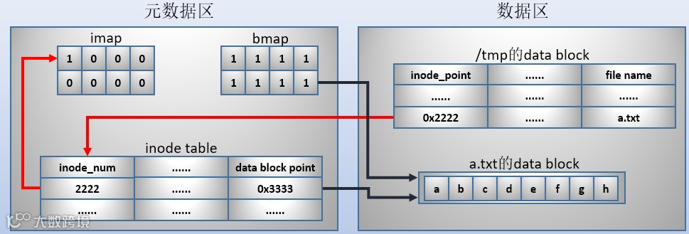 (3).删除父目录/tmp的data block中关于a.txt的记录。这里只要一删除,外界就看不到也找不到这个文件了。 -