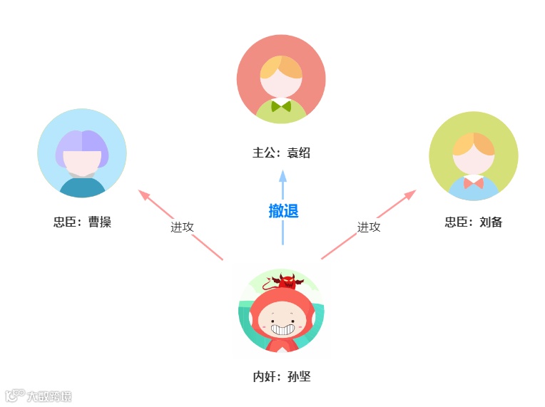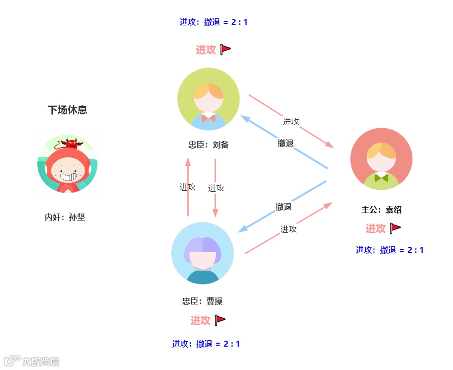 第一轮孙坚向其中一个副官袁绍发送撤退指令,向另外两个副官曹操、刘备发送进攻指令。那么第一轮的结果如下图: