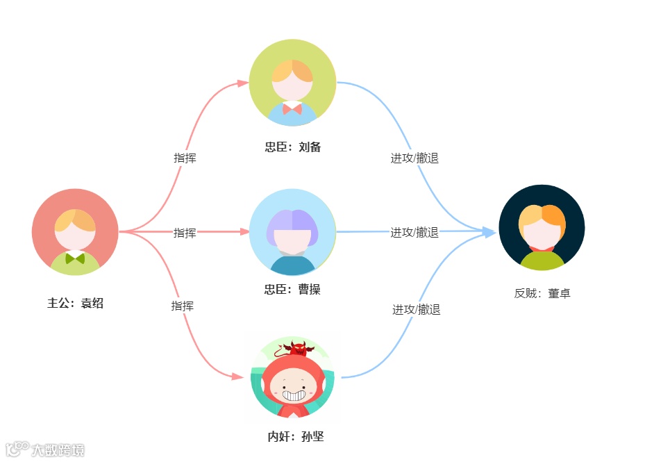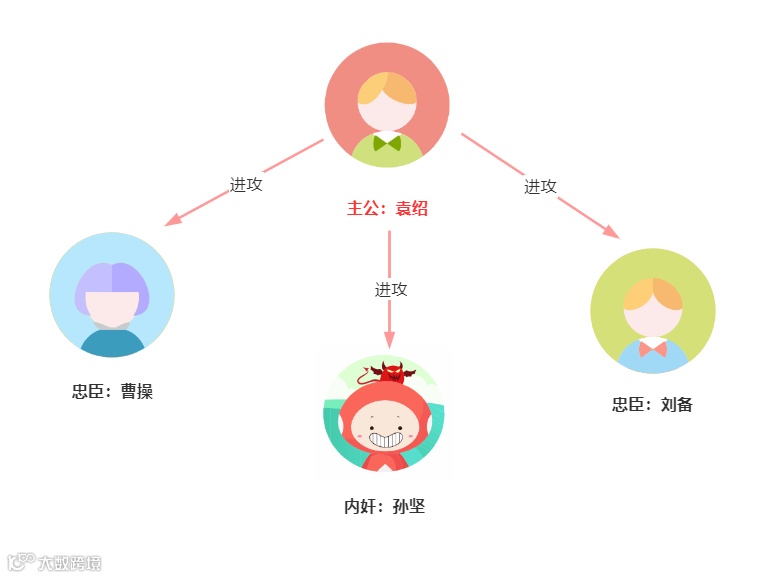 我们用图来演示:袁绍作为主公先发送作战信息,作战指令为进攻。然后曹操、刘备、孙坚收到进攻的作战指令。