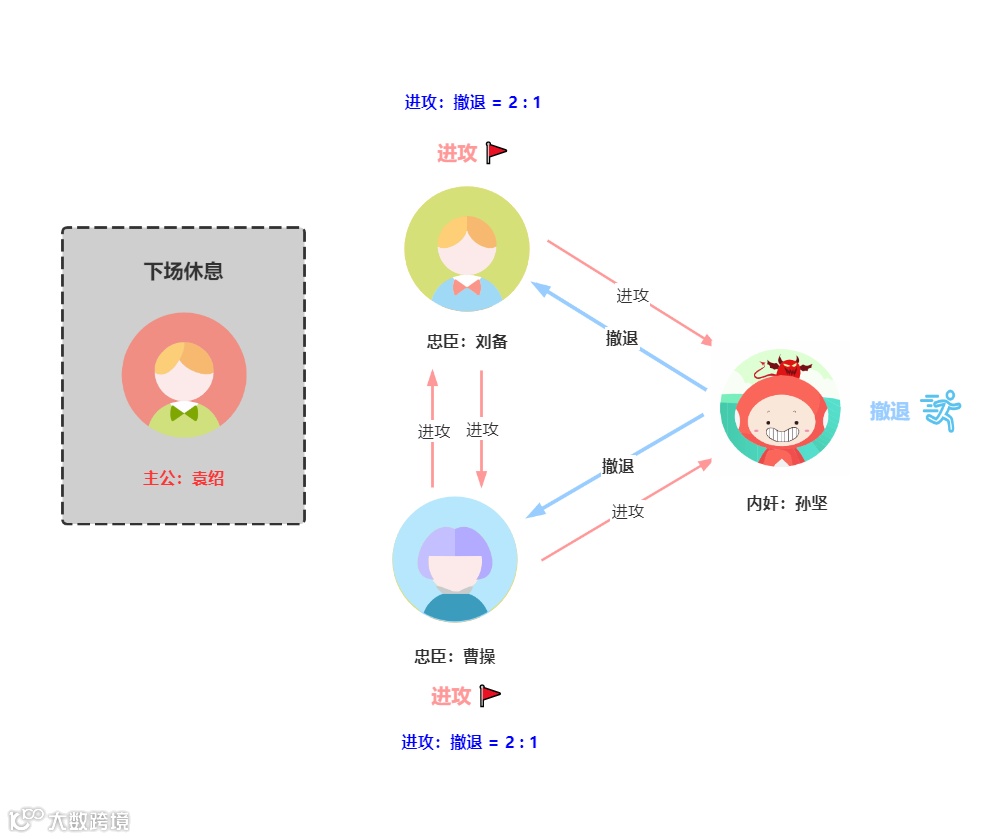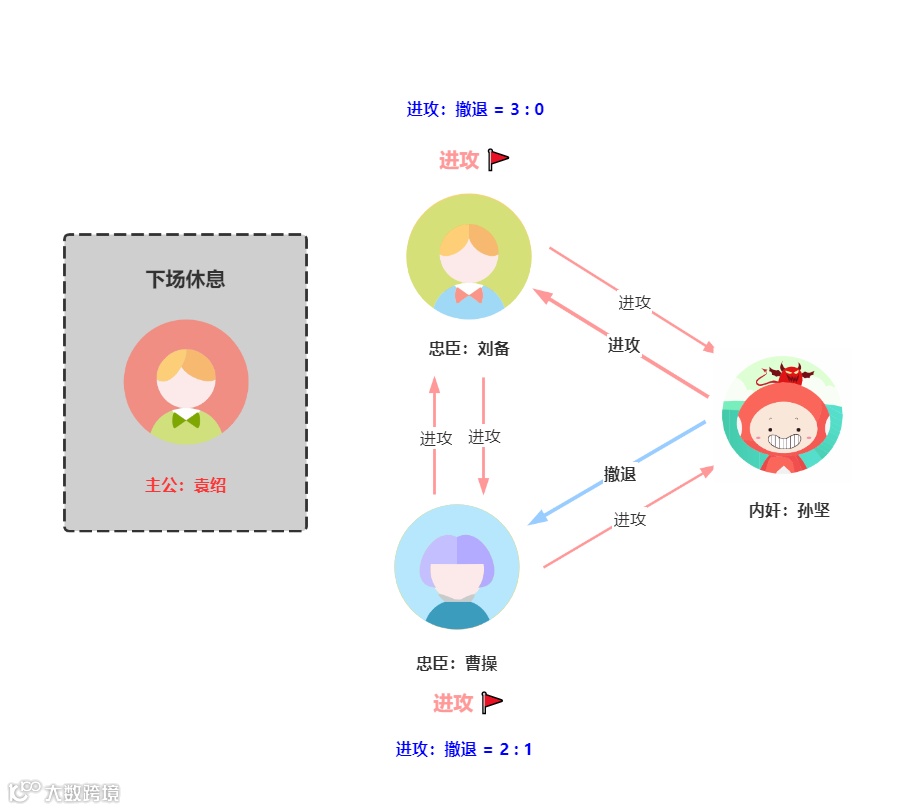 刘备的票数为进攻 2 票,撤退 1 票,曹操的票数为进攻 1 票,撤退 2 票。按照少数服从多数的原则,刘备最后会选择进攻,而曹操会选择撤退,孙坚作为内奸肯定不会进攻,刘备单独进攻反贼董卓,势单力薄,被董卓干掉了。