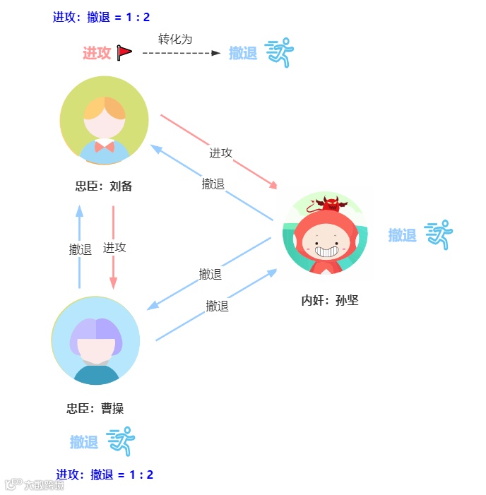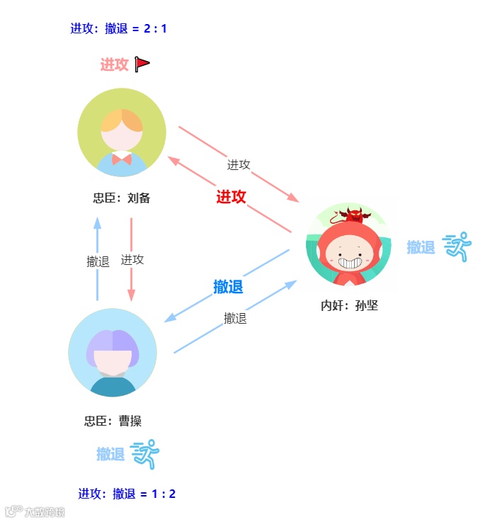 假如孙坚使诈,给曹操发送撤退指令,给刘备发送进攻指令,那么刘备收到的作战信息是进攻 3票,肯定会发起进攻了,而曹操收到的作战信息是进攻 2 票,撤退 1 票,最后曹操还是会进攻,所以刘备和曹操还是联合作战击败了反贼董卓。