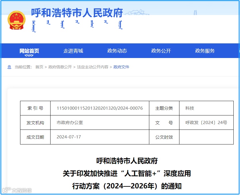 9月2日,链向科技集团从呼和浩特市政府网站了解到,近日,呼和浩特市政府发布了《加快推进“人工智能+”深度应用行动方案(2024—2026年)》。该方案设定了三个阶段的目标,以期到2026年底智能算力供给水平能够全面满足人工智能场景落地发展的需求。