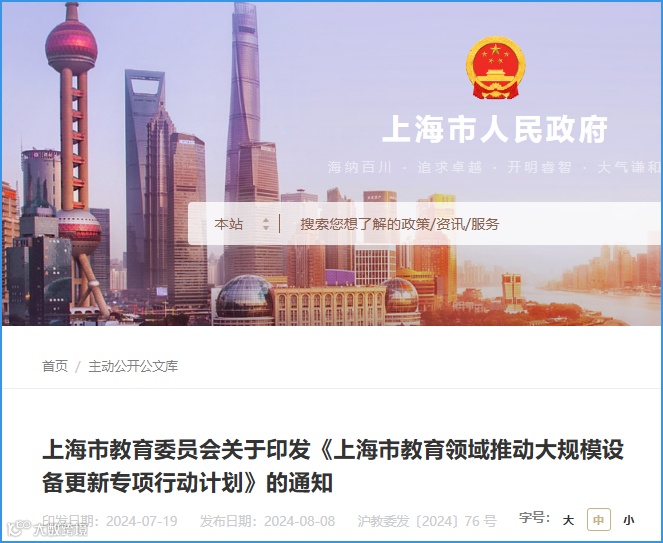 8月8日,链向科技集团从上海市人民政府网了解到,上海市政府今天发布《上海市教育领域推动大规模设备更新专项行动计划》,将支持教学设备配置及更新、落实职业院校专业实训教学设备建设标准、推动中学加强教学仪器设备配置、更新等。