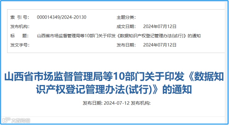 7月15日,链向科技集团从山西省市场监督管理局(省知识产权局)官网了解到,近日,该局等10部门联合印发《数据知识产权登记管理办法(试行)》(以下简称《办法》),规范山西省数据知识产权登记工作开展,加强数据知识产权登记管理,维护数据处理者合法权益,促进数据要素开放流动和开发利用。