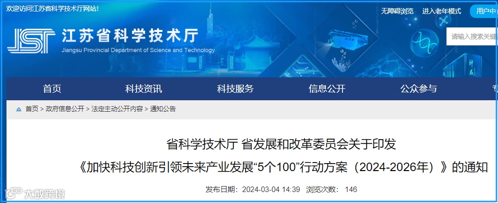 3月8日,链向科技集团从江苏省科技厅网站了解到,近日,江苏省科学技术厅、江苏省发展和改革委员会联合印发《加快科技创新引领未来产业发展“5个100”行动方案(2024—2026年)》(以下简称《行动方案》),在第三代半导体、通用人工智能、量子科技、合成生物、元宇宙等未来产业领域着力实施“5个100”行动,努力开辟未来产业新赛道,加快发展新质生产力。