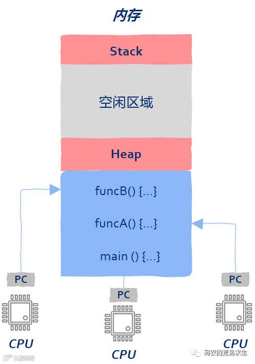 但是现在不一样了,多个CPU可以在同一个屋檐下(进程占用的内存区域)同时执行属于该进程的多个入口函数,也就是说现在一个进程内可以有多个执行流了。