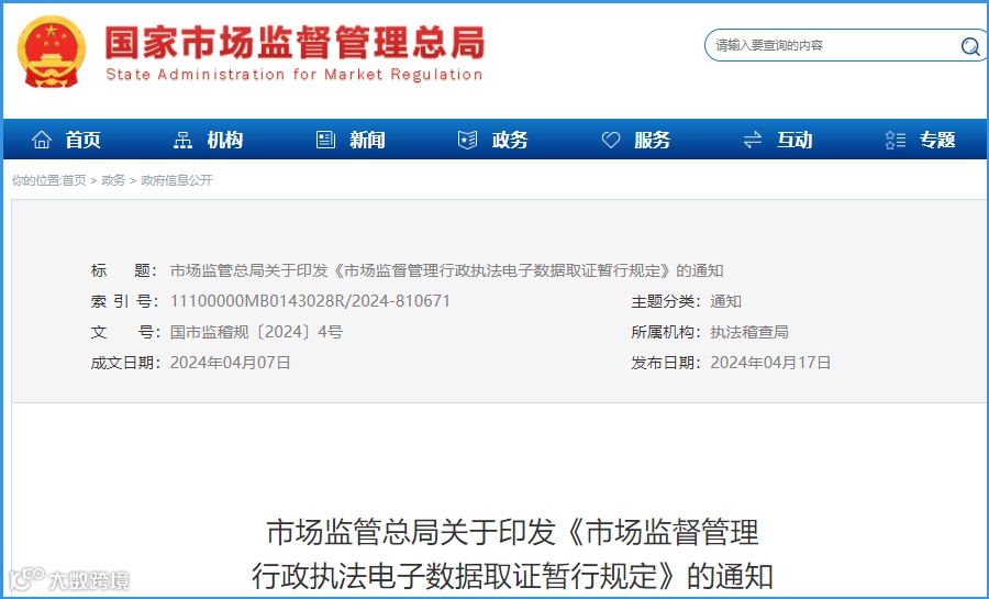4月18日,链向科技集团从国家市场监管总局网站了解到,市场监管总局近日发布《市场监督管理行政执法电子数据取证暂行规定》(以下简称《暂行规定》),于2024年4月7日起正式施行。