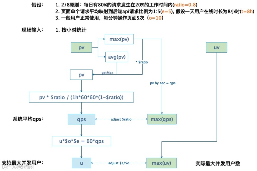 2. 取Max(PV峰值*0.8,每日PV均值)作为目标PV', PV'时段的UV值作为实际并发用户参考值N', 计算PV'/perMinute/N'作为每分钟用户操作触发api次数O'。