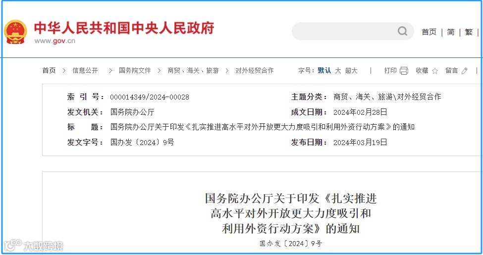 3月20日,链向科技集团从中国政府网站了解到,近日,国务院办公厅印发《扎实推进高水平对外开放更大力度吸引和利用外资行动方案》。