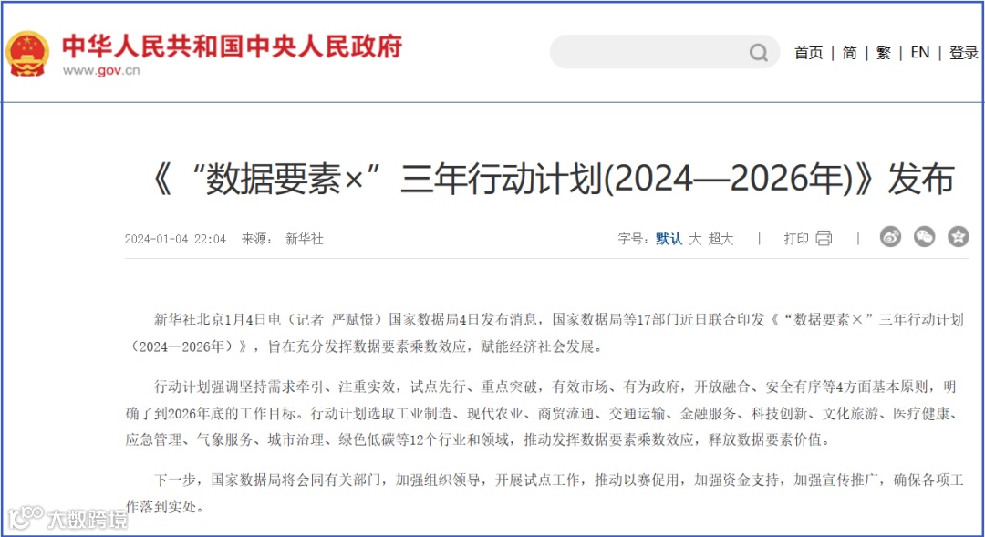 1月5日,链向科技集团从中国政府网网站了解到,近日,国家数据局等17部门联合印发《“数据要素×”三年行动计划(2024—2026年)》(以下简称《行动计划》)。提出到2026年底,数据要素应用广度和深度大幅拓展等一系列目标。