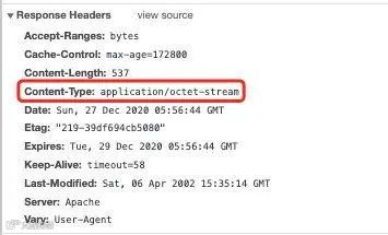 通过 Content-Type 指定资源的方式浏览器等客户端就可以据此作出相关解析处理了,再看下开头的问题,为啥请求图片本来希望是能直接在浏览器上展示的,实际上却直接下载了呢,抓包看下它的 Content-Type