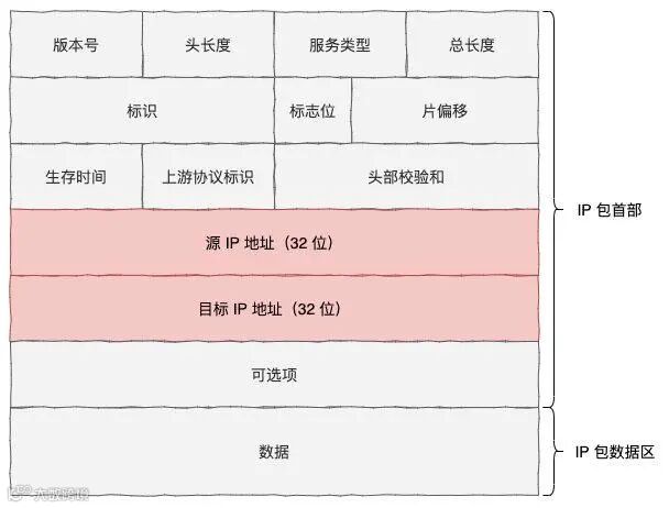 IP 包的首部中定义了32 位的源 IP 地址和目的 IP 地址,如下图所示址