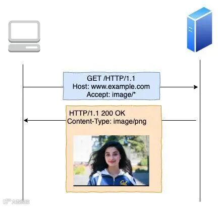 如图示:客户端使用 Accept: image/* 告诉服务器,我想请求 png,jpeg,svg 等属于 image 类型的资源,服务端返回图片的同时用 Content-Type: image/png 告诉客户端资源类型为 png。