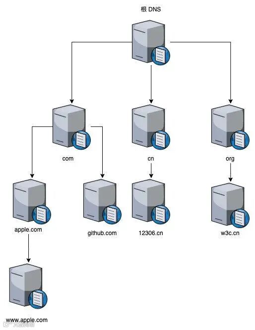 根域名服务器是关键,必须是众所周知的,找到了它,下面的各级域名服务器才能找到,否则域名解析就无从谈起了。既然知道了 DNS 的层次之分,那么不难猜出请求 www.apple.com 的 DNS 解析如下