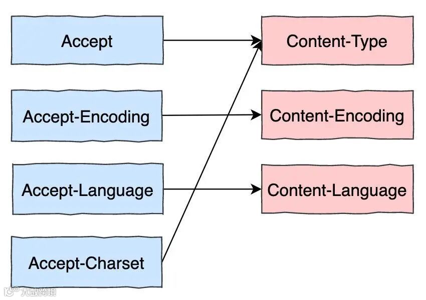 其他请求方,应答方的实体首部对应关系在上文内容协商部分也给出了,再贴一下图: