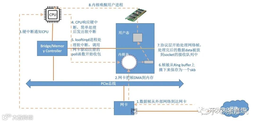 Linux内核对网络包的接收过程大致可以分为接收到RingBuffer、硬中断处理、ksoftirqd软中断处理几个过程。其中在ksoftirqd软中断处理中,把数据包从RingBuffer中摘下来,送到协议栈的处理,再之后送到用户进程socket的接收队列中。