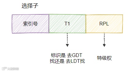 段寄存器里面也不是直接放段基地址了,而是放了一个叫选择子的东西。