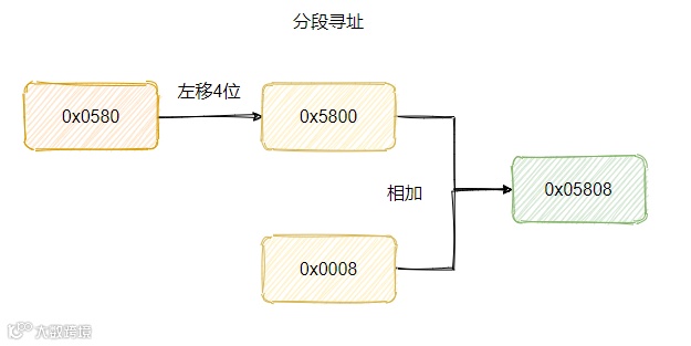 比如现在的要访问的内存地址是0x05808,那么段基地址可以是 0x0580,偏移量就是 0x0008。