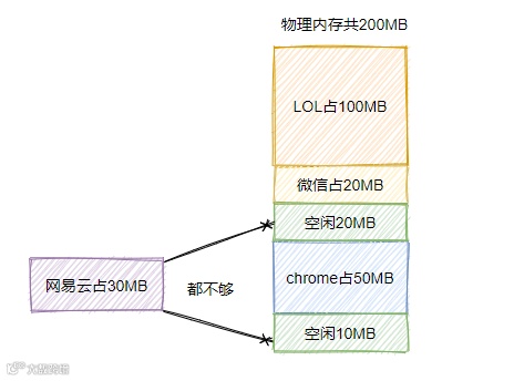 假设此时你有 200M 内存,此时有 3 个应用在运行,分别是 LOL、chrome、微信。