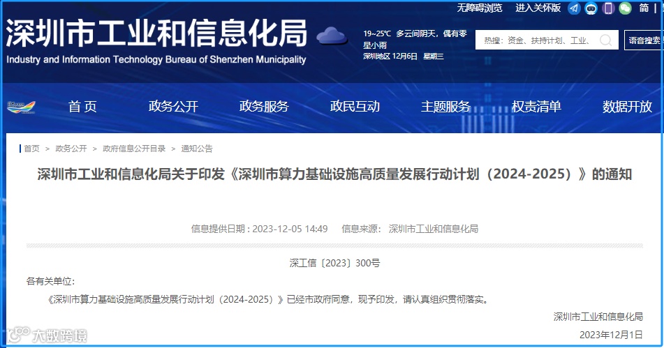 12月6日,链向科技集团从深圳市工业和信息化局网站获悉,近日,深圳市工业和信息化局近日印发《深圳市算力基础设施高质量发展行动计划(2024-2025)》。(以下简称“行动计划”),提出到2025年,深圳基本形成空间布局科学合理,规模体量与极速先锋城市建设需求相匹配,计算力、运载力、存储力及应用赋能等方面与数字经济高质量发展相适应,绿色低碳和自主可控水平显著提升的先进算力基础设施布局,构建通用、智能、超算和边缘计算协同发展的多元算力供给体系,打造“多元供给、强算赋能、泛在连接、安全融通”的中国算网城市标杆。