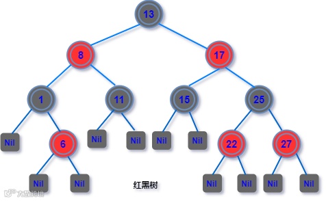 红黑树中每个结点都被标记了红黑属性,红黑树除了有普通的「二叉查找树」特性之外,还有以下的特征: