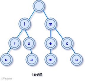 比如对单词序列lru, lua, mem, mcu 建立Trie树如下: