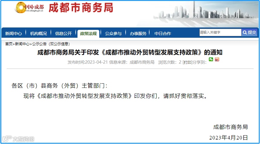 4月23日,链向科技集团从成都市商务局官网了解到,近日,成都市商务局印发《成都市推动外贸转型发展支持政策》(以下简称《政策》),从四个方面发力加快推动成都外贸转型升级和高质量发展,聚焦稳链强链,建设贸易强市,该《政策》有效期自2023年1月1日至2023年12月31日。