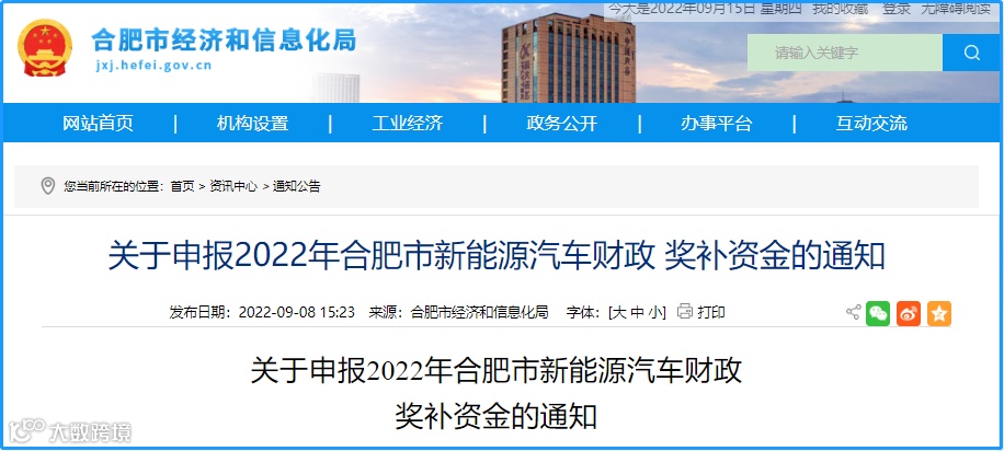 关于申报2022年合肥市新能源汽车财政奖补资金的通知