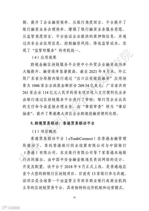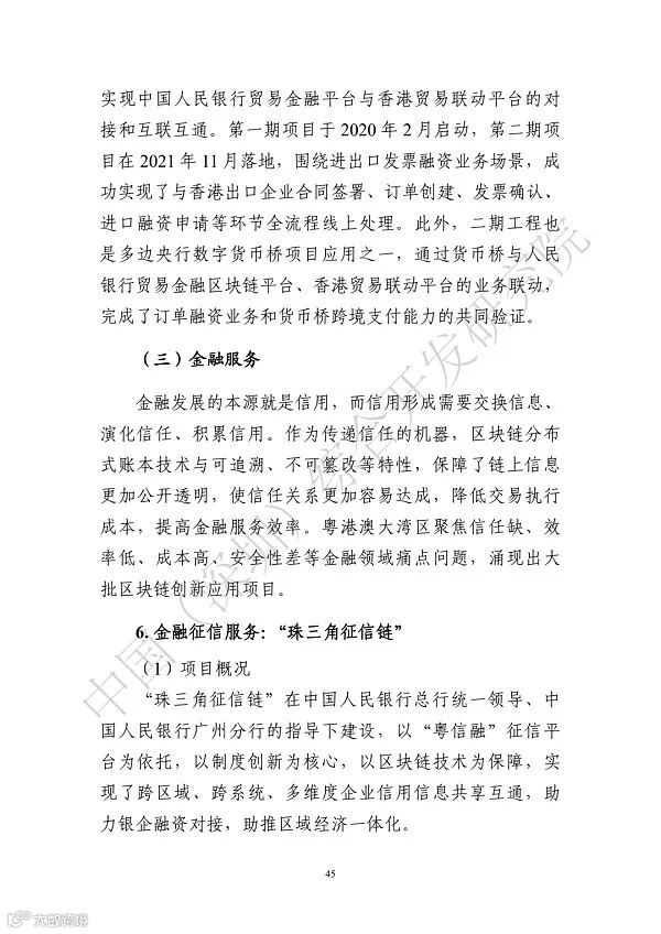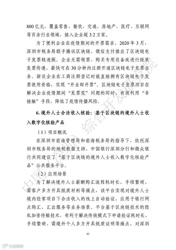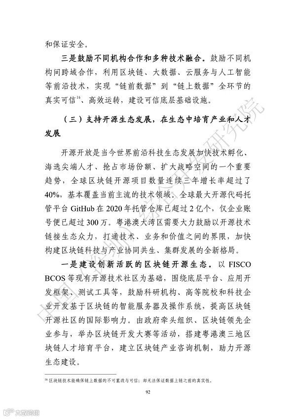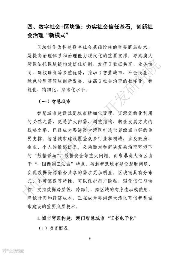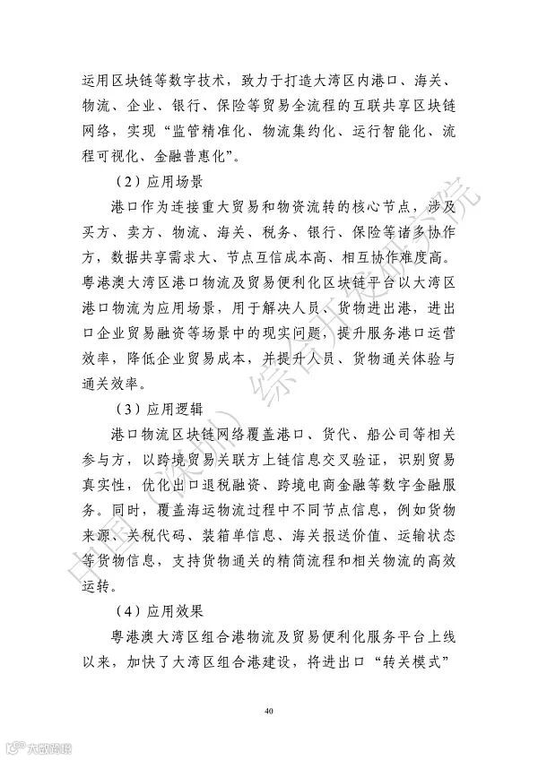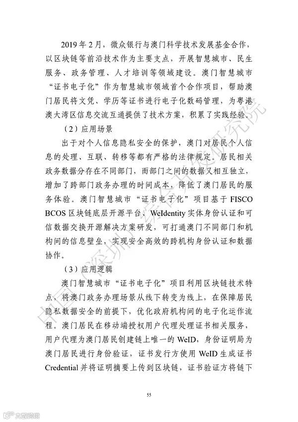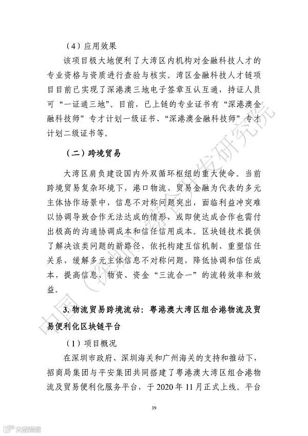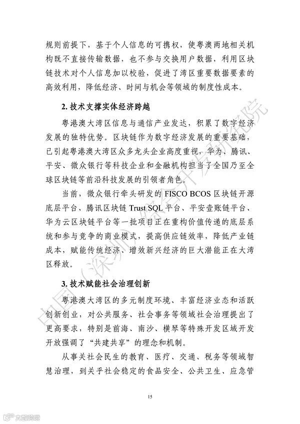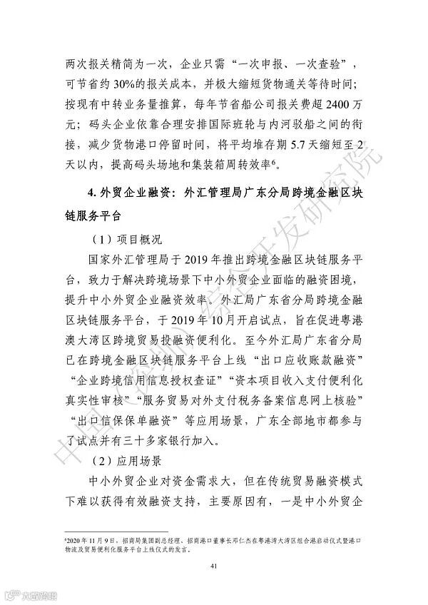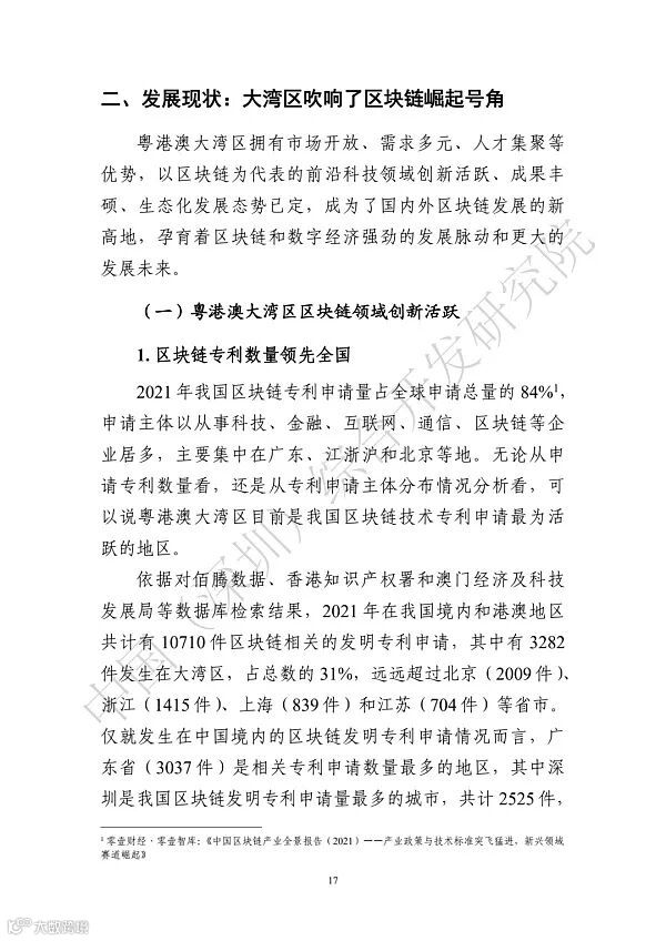 中国(深圳)综合开发研究院院长助理刘国宏在报告发布时表示,综研院课题组查阅大量文献资料,在半年多时间中走访调研了粤港澳大湾区的多家科技和金融企业。研究发现,大湾区已有众多机构前瞻性地布局了以区块链为代表的众多前沿科技,有效地开展了可信底层基础设施建设、国产开源创新生态探索等一系列重大创新实践,在区块链助力粤港澳大湾区一体化发展中积累了诸多应用案例。