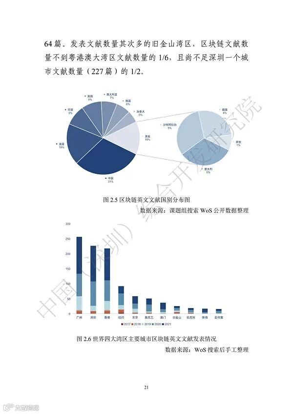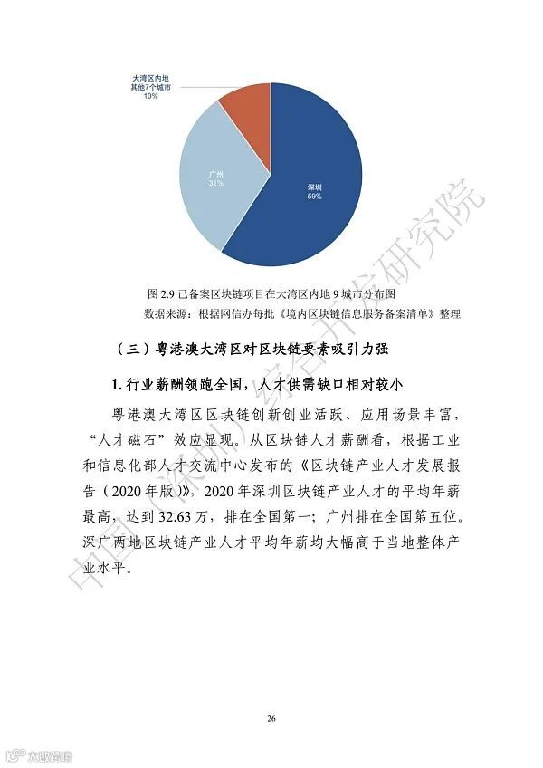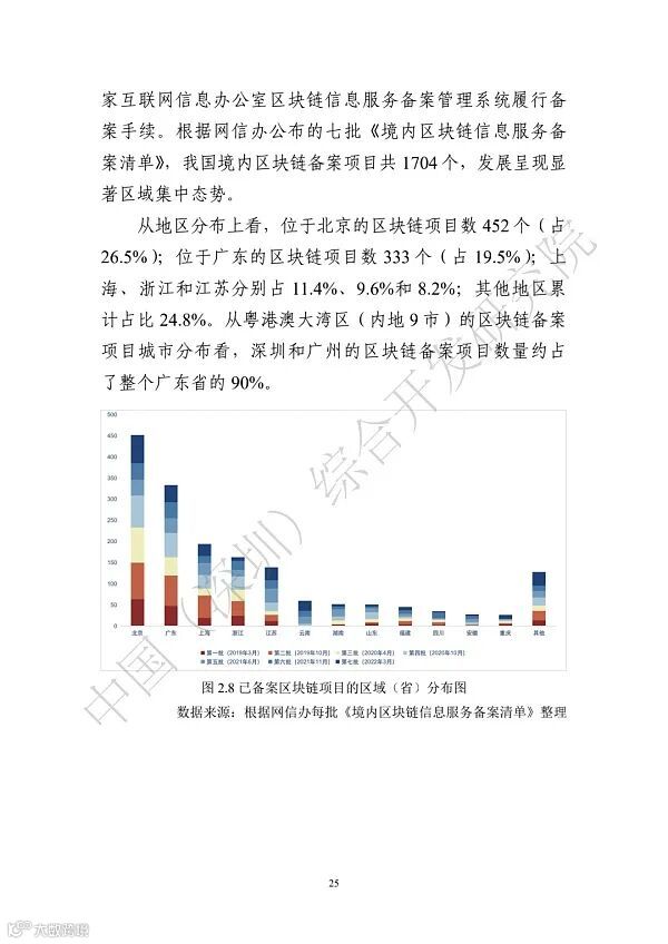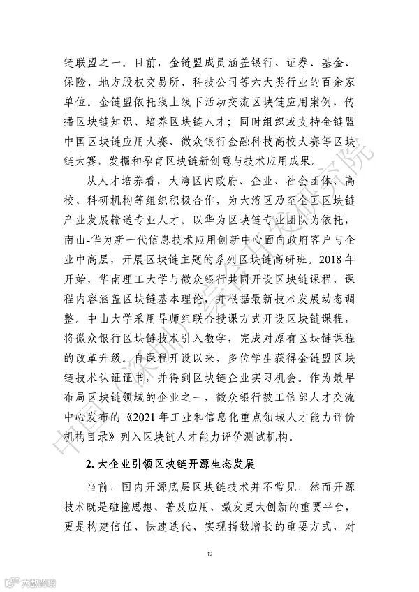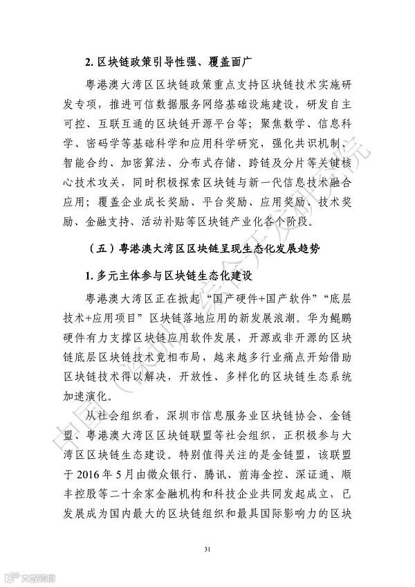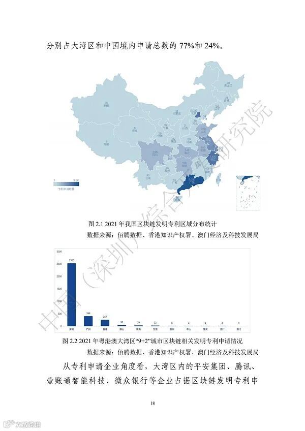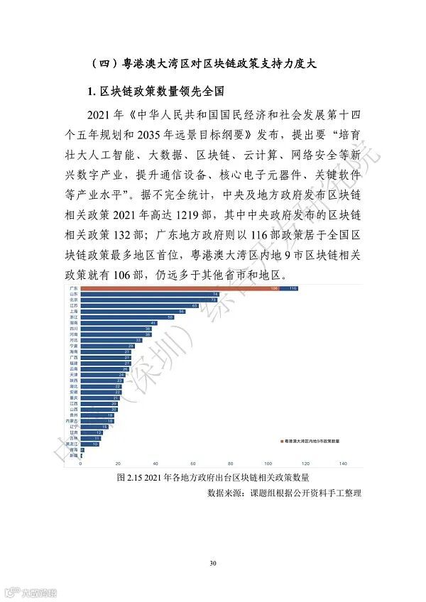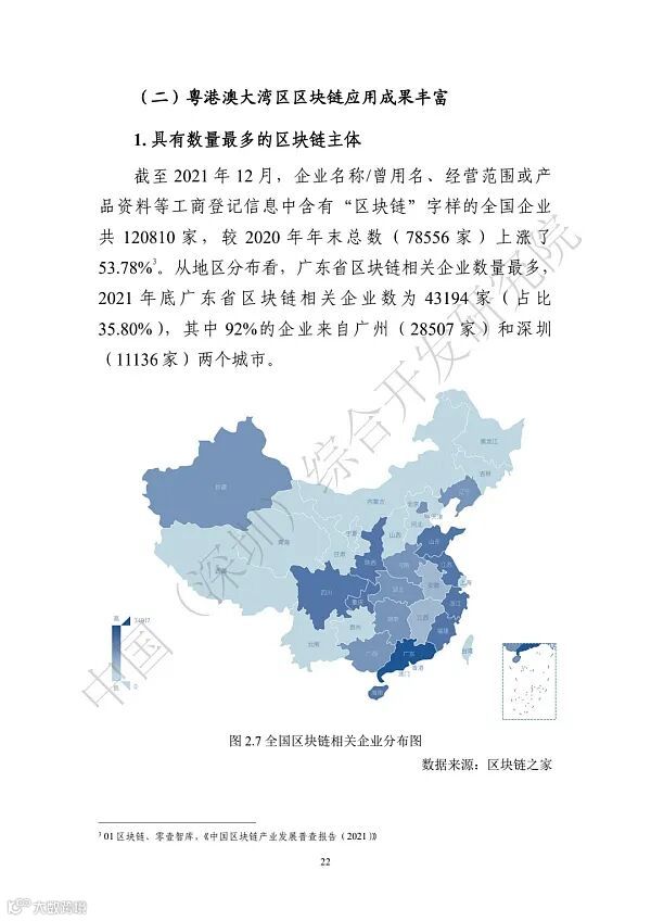 根据报告显示,粤港澳大湾区对区块链政策支持力度大,2021年区块链相关政策达106部;全年有3282件与区块链相关的发明专利申请,占全国总数的31%;大湾区区块链创新创业活跃、应用场景丰富,“人才磁石”效应显现。粤港澳大湾区正在成为众多科技创新的试验田,目前已有微众银行、腾讯、平安、华为等一批大湾区的优秀企业或机构前瞻性布局了以区块链为代表的众多前沿科技,卓有成效地开展了可信底层基础设施建设、国产开源创新生态探索等一系列重大创新实践。