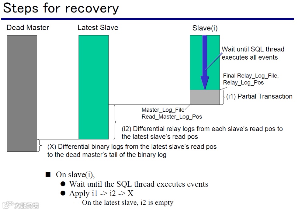 如果是使用gtid复制,需要生成3种diff binlog文件,然后顺序apply diff binlog文件,恢复从库。非gtid复制,先change master到lastest slave,先让slave从lastest slave恢复数据,然后再apply dead master未发送的diff binlog 文件,完成binlog补齐。