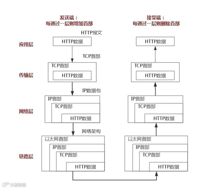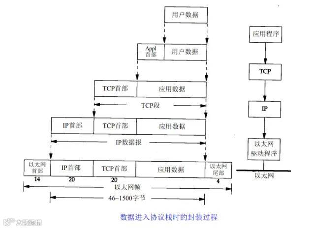 上图清楚地表示了TCP/IP协议中每个层的作用,而TCP/IP协议通信的过程其实就对应着数据入栈与出栈的过程。入栈的过程,数据发送方每层不断地封装首部与尾部,添加一些传输的信息,确保能传输到目的地。出栈的过程,数据接收方每层不断地拆除首部与尾部,得到最终传输的数据。