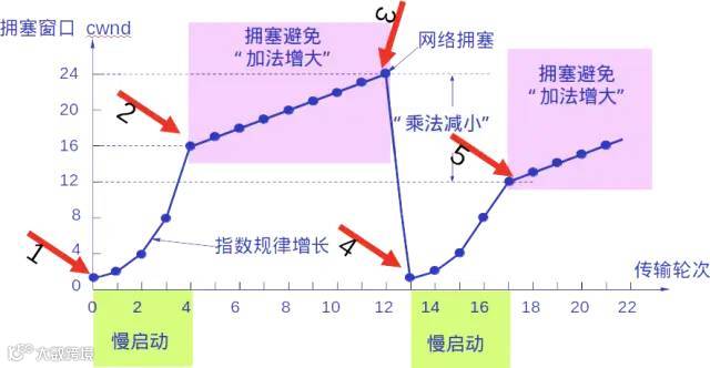 每经过一个传输轮次,拥塞窗口 cwnd 就加倍。一个传输轮次所经历的时间其实就是往返时间「RTT」。不过“传输轮次”更加强调:把拥塞窗口cwnd所允许发送的报文段都连续发送出去,并收到了对已发送的最后一个字节的确认。
