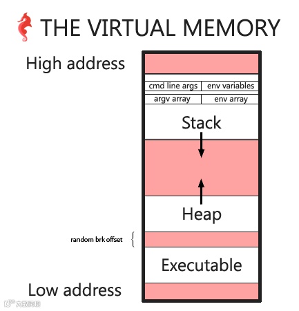 可以看出上面所说的这个差值其实就是0-0x02000000中的一个随机数,这种技术称为ASLR(Address Space Layout Randomisation),是一种计算机安全技术,随机安排虚拟内存中堆栈空间的位置,可以有效防止黑客攻击。通过以上分析,可以画出内存分布图如下: