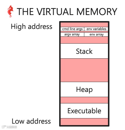 上图并不是特别详细的内存管理图,高地址其实还有内核空间等等,但这不是这篇文章的主题。从图中可以看到高地址存储着命令行参数和环境变量,之后是栈空间、堆空间和可执行程序,其中栈空间向下延申,堆空间向上增长,堆空间需要使用malloc分配,是动态分配的内存的一部分。
