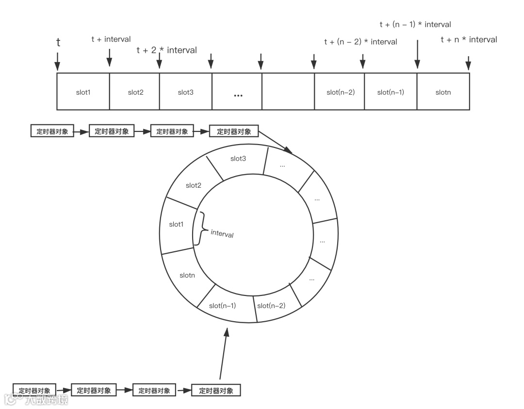 时间轮的基本思想是将从现在时刻 t 加上一个时间间隔 interval,以 interval 为步长,将各个定时器对象的过期时间按步长分布在不同的时间槽(time slot)中,当一个时间槽中出现多个定时器对象时,这些定时器对象按加入槽中的顺序串成链表,时间轮的示意图如下: