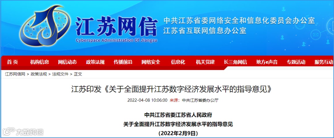 4月11日,链向科技从江苏网信网站获悉。近日,江苏省委省政府发布《关于全面提升江苏数字经济发展水平的指导意见》(以下简称“《意见》”),全面推进江苏经济社会数字化转型,着力打造数字经济新引擎,激发数字时代新动能,培育数字经济新优势。