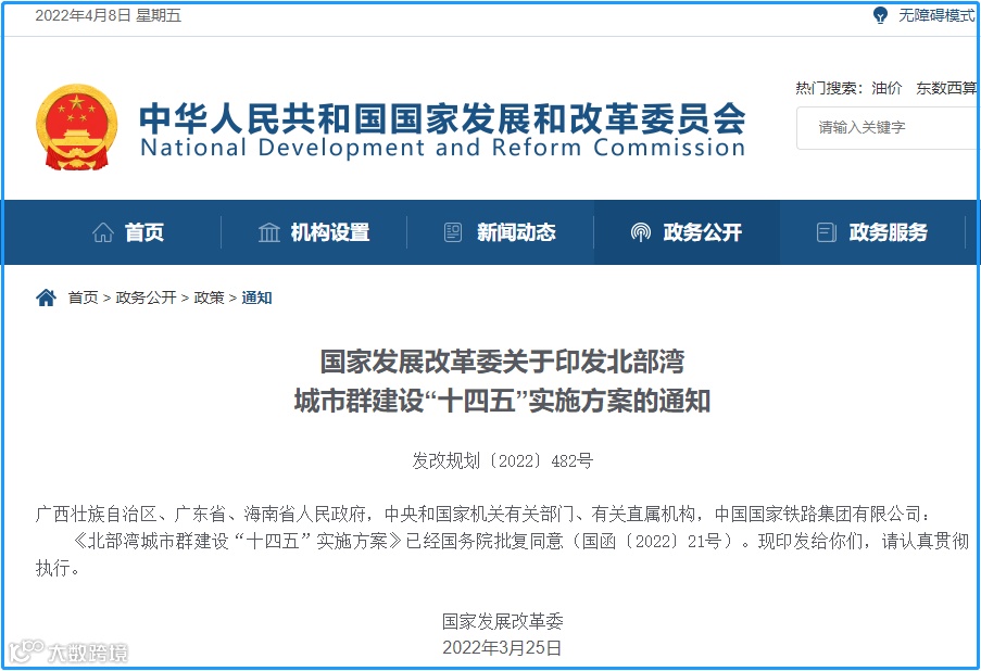 4月8日,链向科技从国家发改委网站获悉。近日,国家发改委印发《北部湾城市群建设“十四五”实施方案》(简称《方案》)提出,到2025年,北部湾城市群进一步发展壮大,常住人口城镇化率提高5个百分点以上,一体化发展水平持续提升,生态环境优美、经济充满活力、生活品质优良的蓝色海湾城市群初步建成。