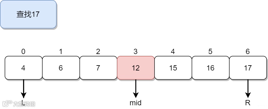 图中呢,我们以查找 17 这个数字为例,L 和 R 所圈定的,就是当前的查找区间,一开始 L= 0,R = 6,mid 所指向的就是数组的中间位置,根据 L 和 R 计算得到 mid 的值是 3。查看数组第 3 位的值是 12,比待查找值 17 要小,说明如果 17 在这个有序数组中,那它一定在 mid 所指向位置的后面,而 mid 本身所指向的数字已经确定不是 17 了,所以下一次我们可以将查找区间,定位到 mid + 1 到 R,也就是将 L 调整到 mid + 1 (即数组第 4