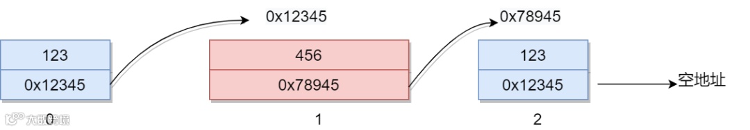 第二个节点中的指针域为0x0,这是一个特殊的地址,叫做空地址,指向空地址意味着它是这个链表结构的最后一个节点。