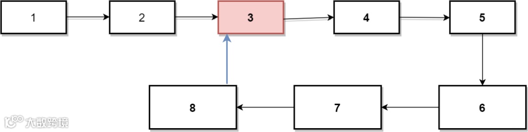 如上图所示,节点8指向了3,这样形成了3,4,5,6,7,8的环状结构,此时使用指针遍历链表将永无止境。那通过什么办法判断是否有环呢?