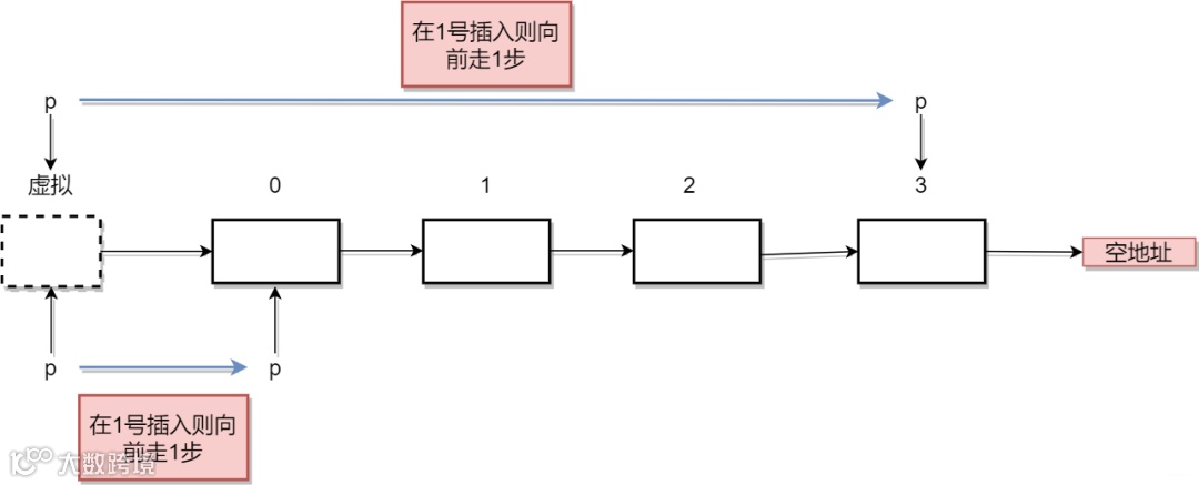 ok,我们看看是不是方便了。增加了虚拟节点,如果插入第5个位置,我们只需要向后移动5位,如果插入到0号位置,向后移动0步即可,即p指针指向虚拟节点不懂,直接将新的节点插入到虚拟头结点后面完事儿。