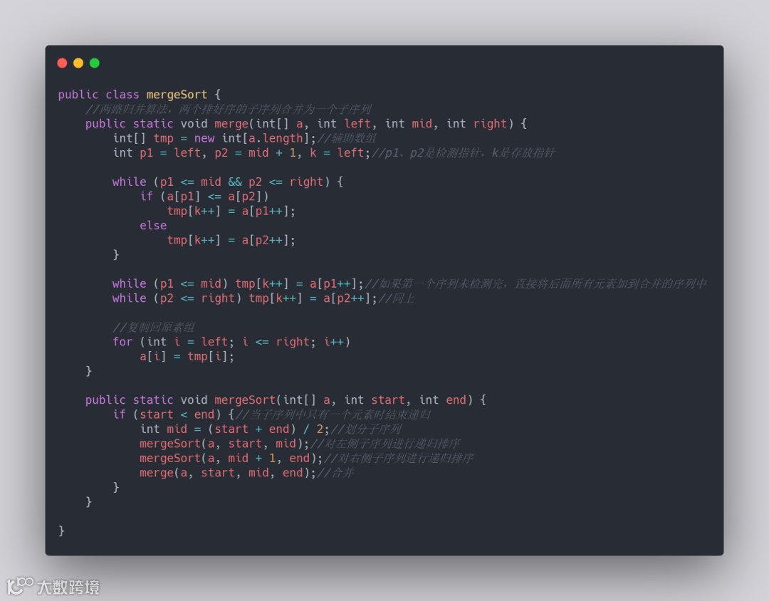 停!!这是我之前说过的常考算法题之一,中心思想即分治,可通过递归一直拆分,递归的结束条件即不可再分,即分为1个的时候就停止。从第一个开始时将每一个模块当作一个已经排序好的数组,有如双指针,在两个数组头设立指针,进行值的比较,然后插入到新数组中,上代码咯