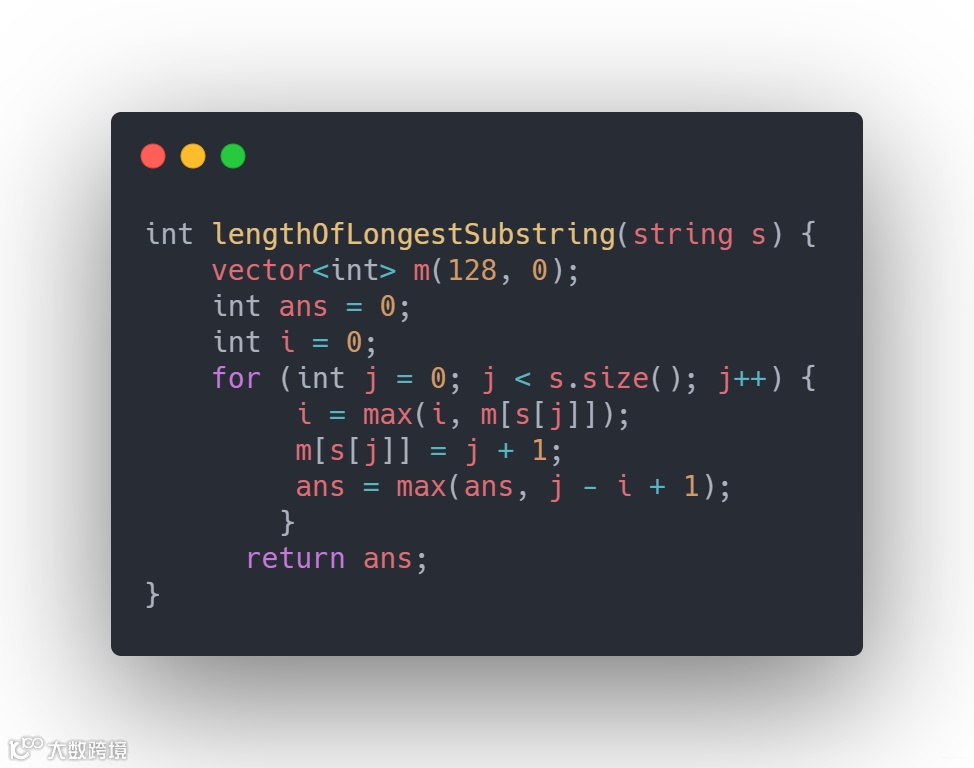 行,差不多时间了,写个简单代码吧,实现一个无重复字符的最长子串
