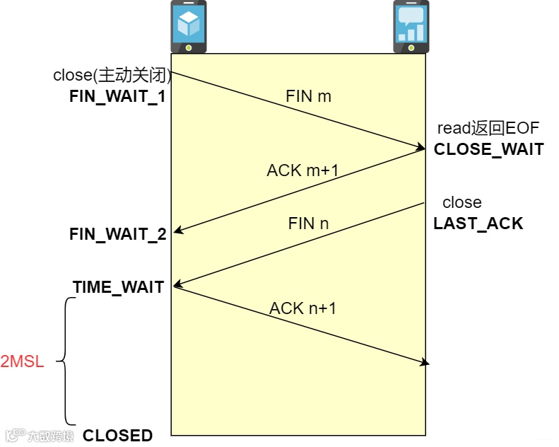 如下图所示的TCP四次挥手,TCP连接准备终止的时候会发送FIN报文,主机2进入CLOSE_WAIT状态并发送ACK应答。主机1会在TIMEWAIT停留2MSL的时间。