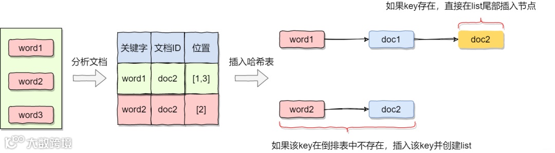 将关键字key插入哈希表。如果哈希表已存在这个key,就在对应的posting list中追加节点,记录文档ID。如果哈希表没有响应的key则插入该key并创建posting list和对应的节点